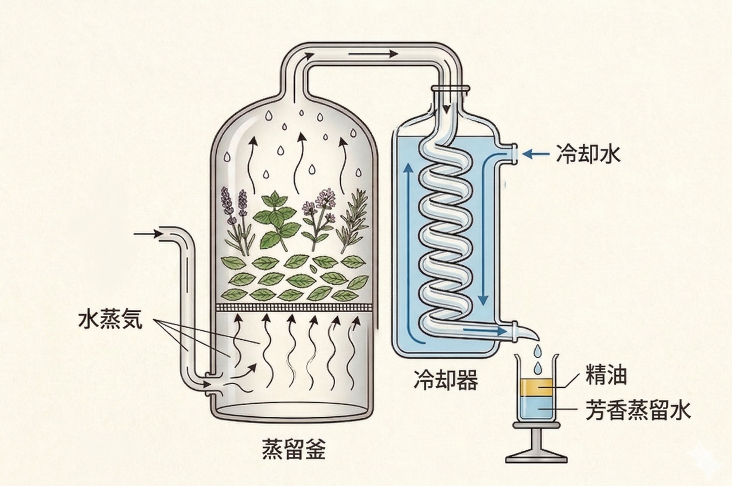 水蒸気蒸留法は、アロマテラピーで使われる精油の抽出において、最も一般的に広く用いられている方法です。